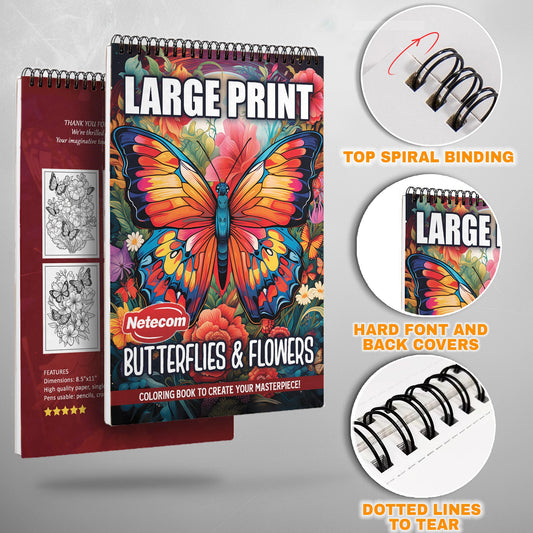Large Print Butterflies and Flowers Spiral Bound Coloring Book, Delicate Butterflies and Floral Beauty in Large Print, Ideal for Stress Relief and Botanical Art Enthusiasts