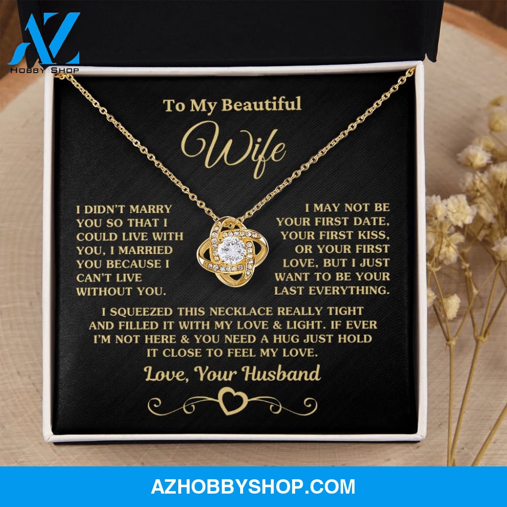 The Message Says: "To My Beautiful Wife - I didn't marry you so that I could live with you. I married you because I can't live without you. I may not be your first date, your first kiss, or your first love, but I just want to be your last everything. I squeezed this necklace really tight and filled it with my love and light. If I’m ever not here and you need a hug, just hold this close and feel my love. Love, Your Husband"