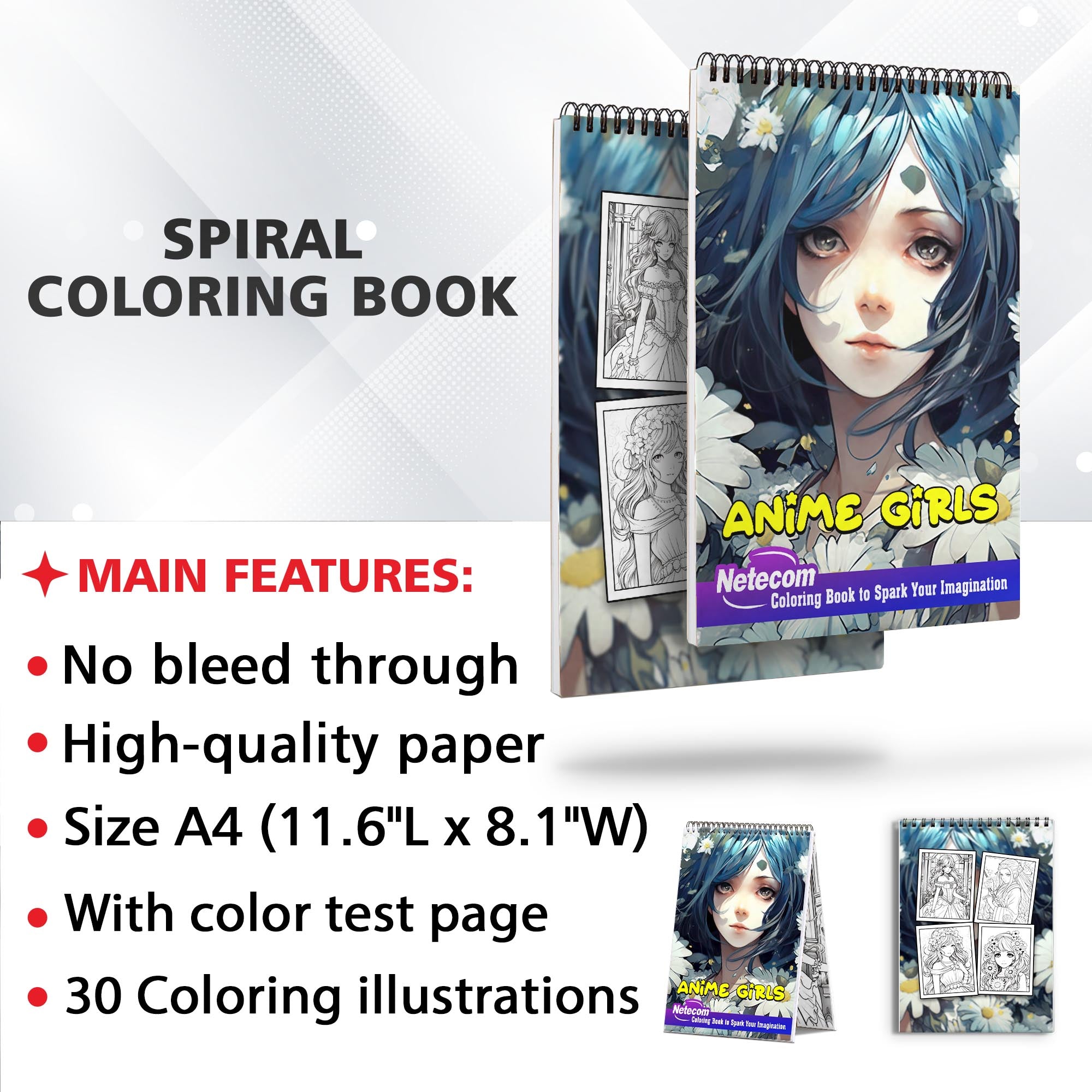 Anime Girls Spiral Bound Coloring Book, Experience 30 Charming Coloring Pages, Celebrating Cute and Lively Anime Girls in Playful Scenes
