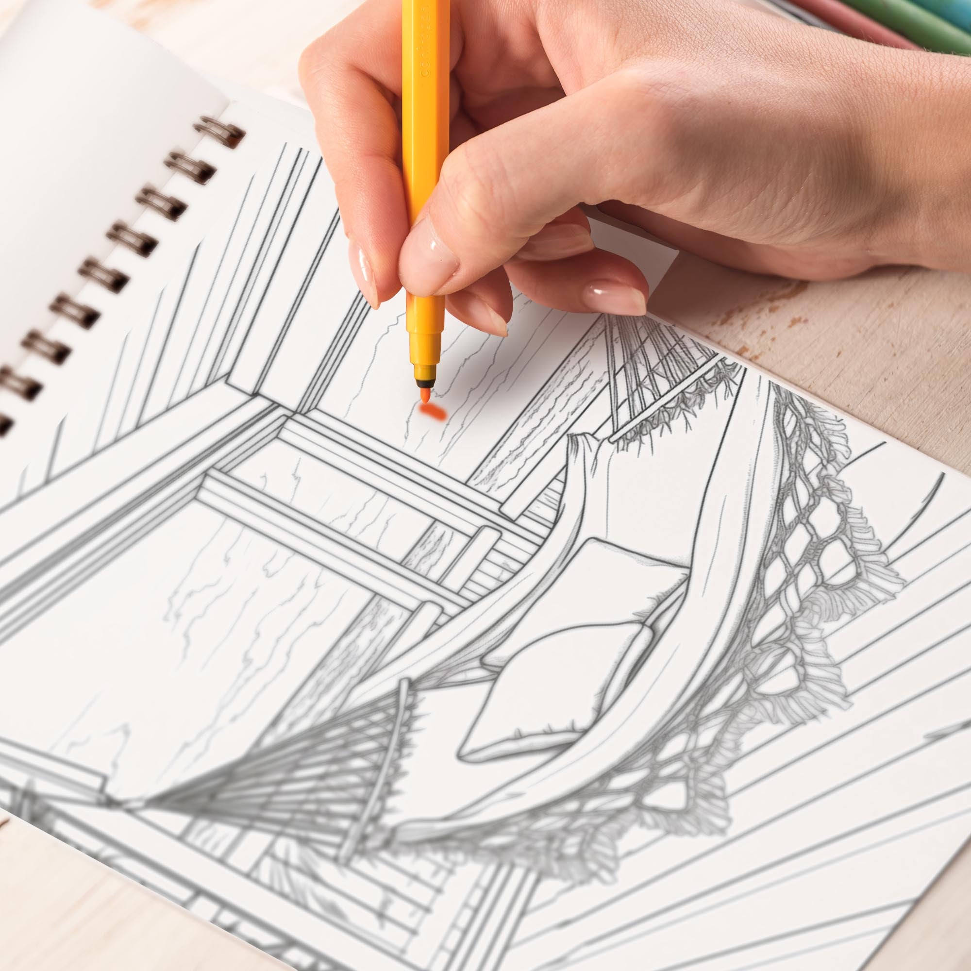 Scenic illustrations: From sandy beaches to tropical palm trees, each page features a different beach scene in a beautifully detailed design. The illustrations capture the beauty of the ocean and the tranquility of the beach, allowing you to escape into a world of relaxation.