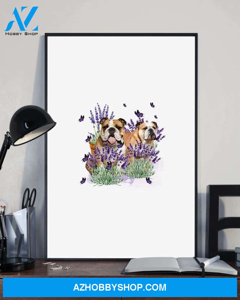 Bulldog with lavender flower poster
