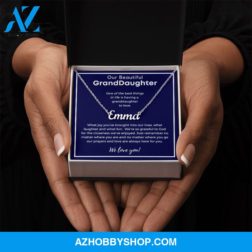 This stylish necklace features a cursive name design suspended on an 16”-18” adjustable cable chain, making it both personal and beautiful! Your necklace will be custom made upon ordering in the name or word of your choice, with up to 10 characters. It's a gift that they will surely want to keep close to their heart forever!
