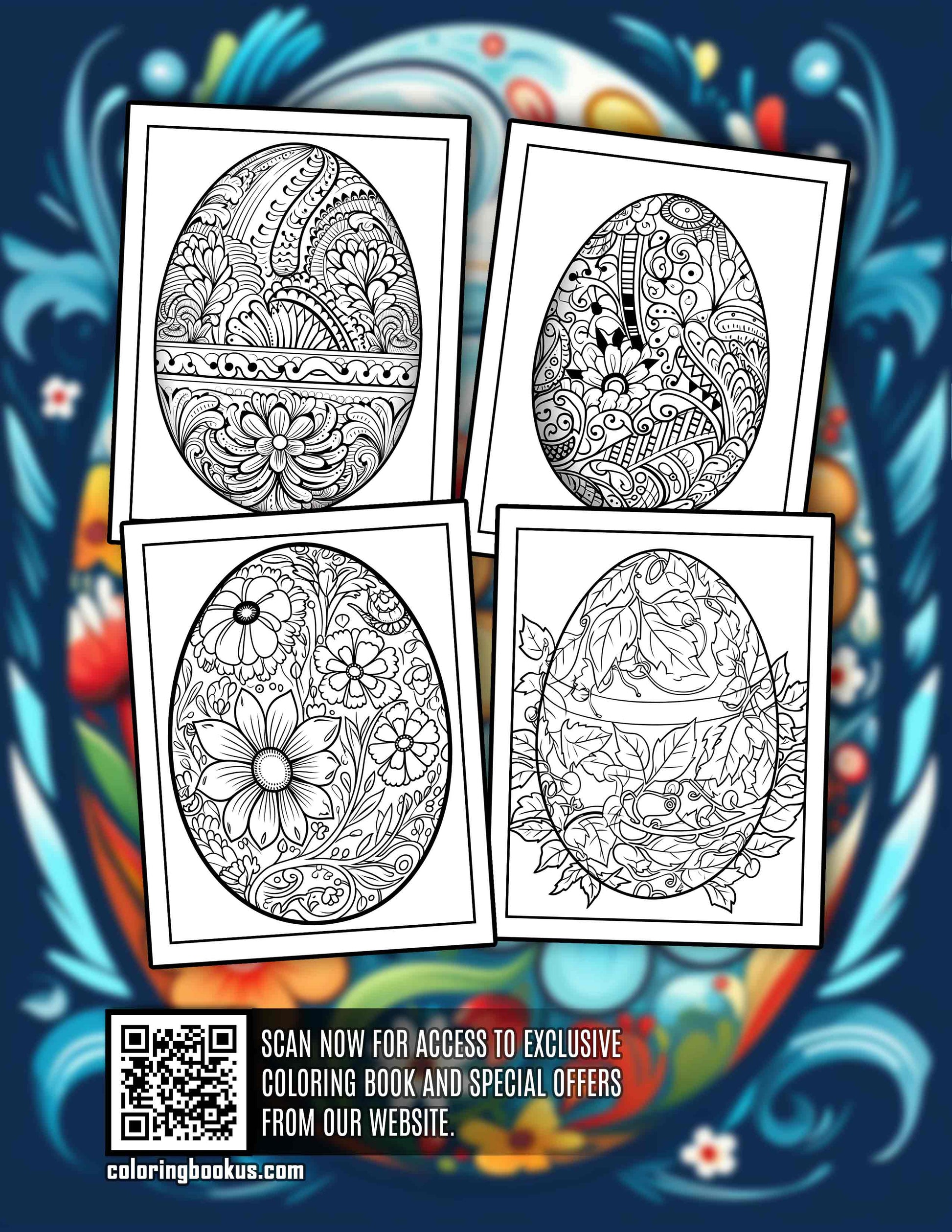 • 30 intricate illustrations featuring a variety of Easter egg designs, each with its own unique patterns and decorations. From traditional patterns to whimsical and modern designs, each page celebrates the vibrancy and creativity associated with Easter eggs.