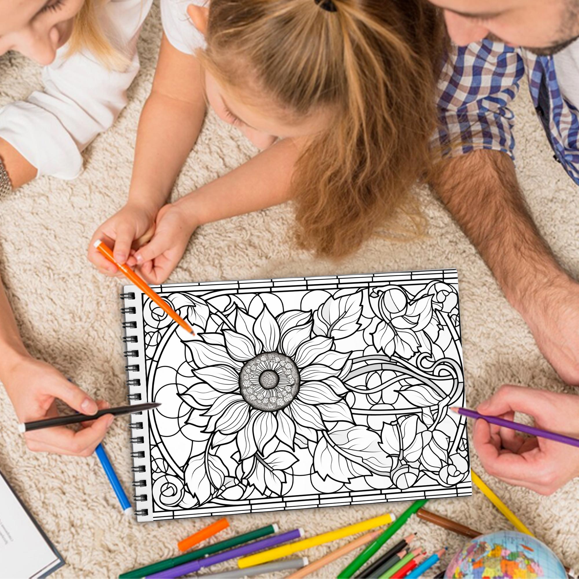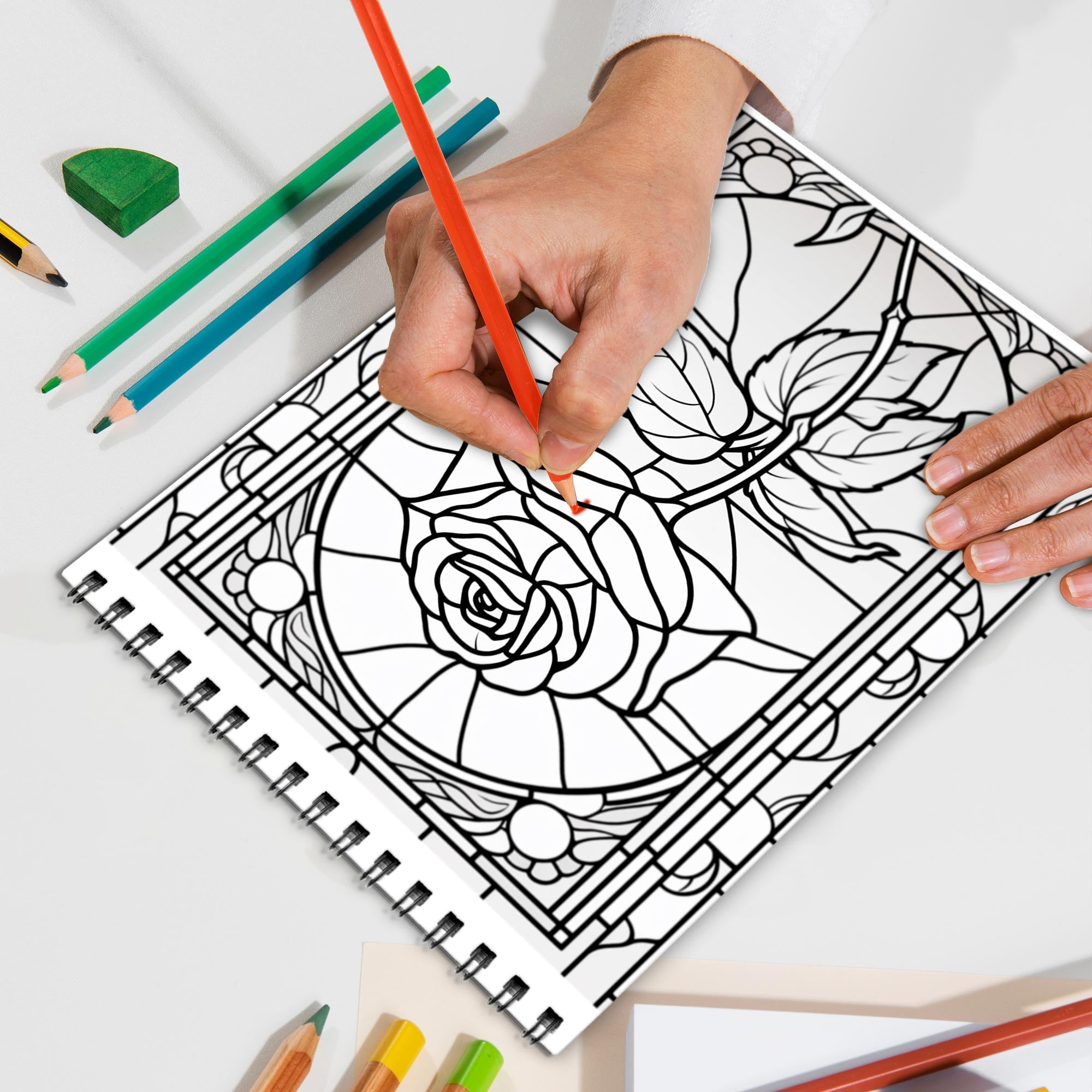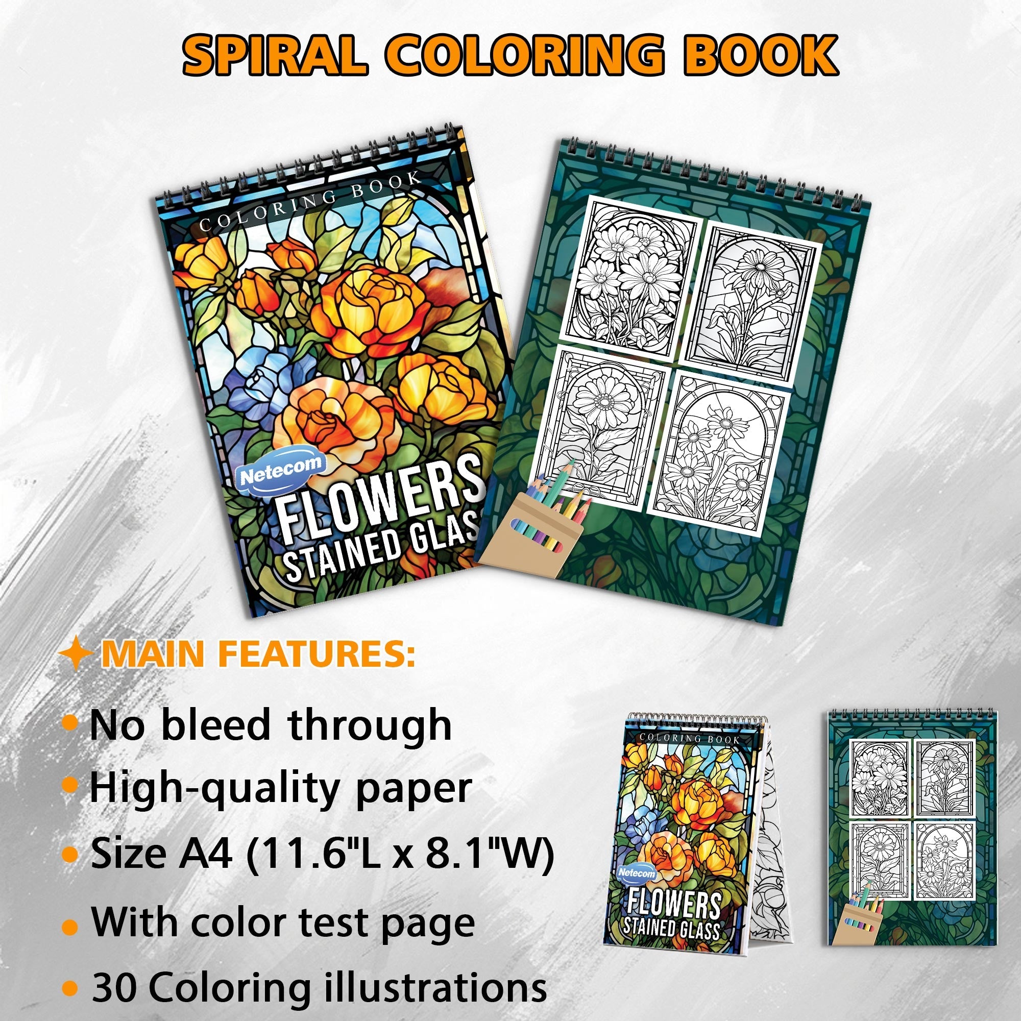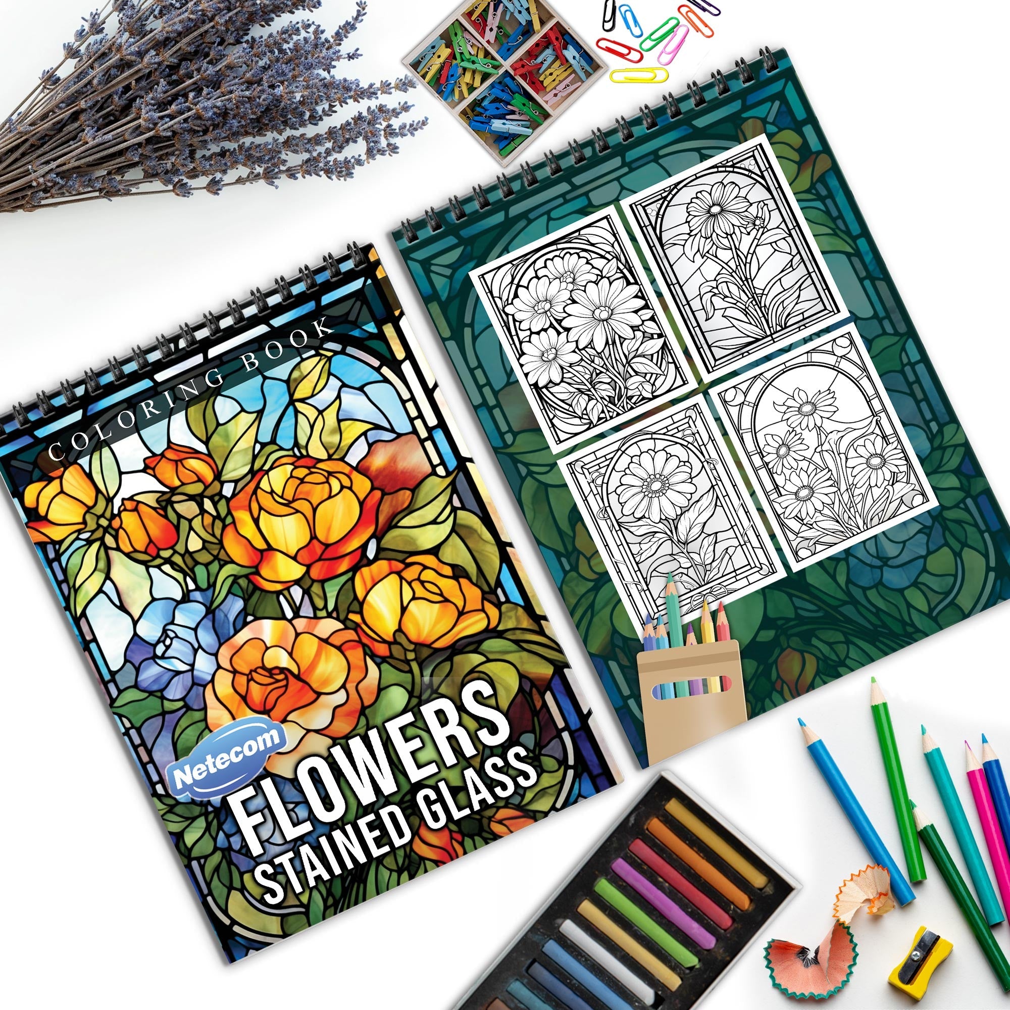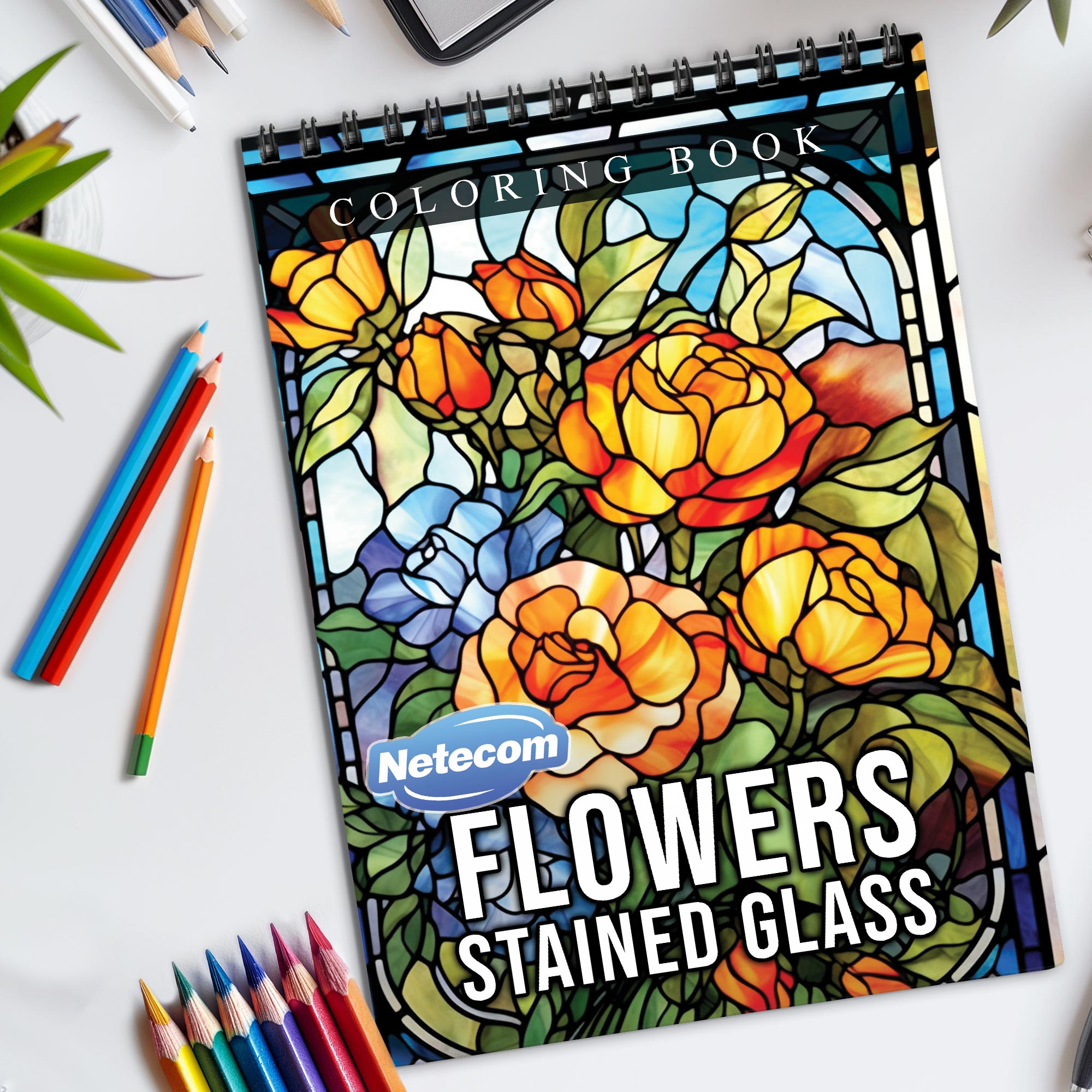 Flowers Stained Glass Spiral Bound Coloring Book, Vibrant Flower Designs in Stained Glass Style, Perfect for Botanical Lovers Seeking a Colorful Challenge