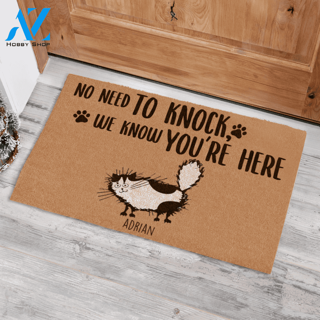 Fluffy Cat, No Need To Knock We Know You Are Here Personalized Doormat HQ