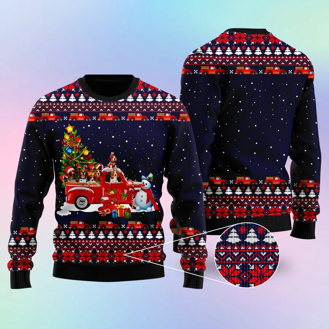 Funny Dogs With Red Truck Christmas Holiday Ugly Christmas Sweater