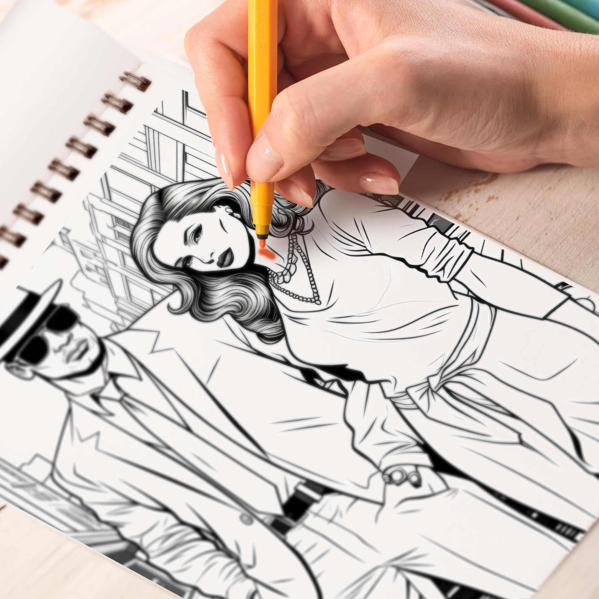 • 30 alluring black line drawings of stylish gangster couples, entwined in scenes that showcase their complex relationships, eagerly awaiting your artistic touch to bring them to life.