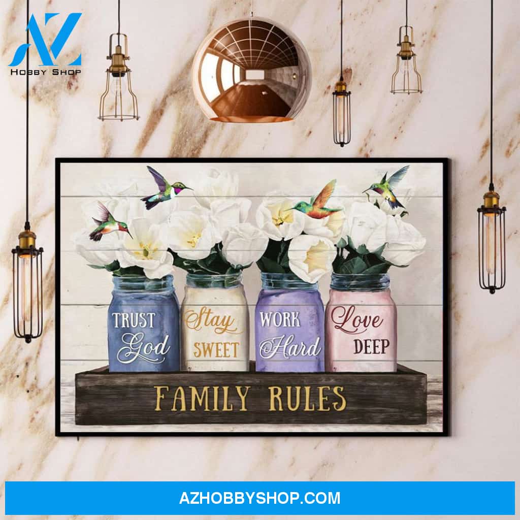 Hummingbird Family Rules Trust God Stay Sweet Work Hard Love Deep Canvas And Poster, Wall Decor Visual Art
