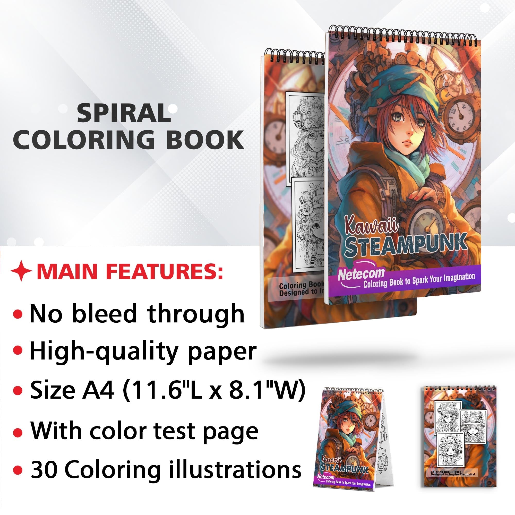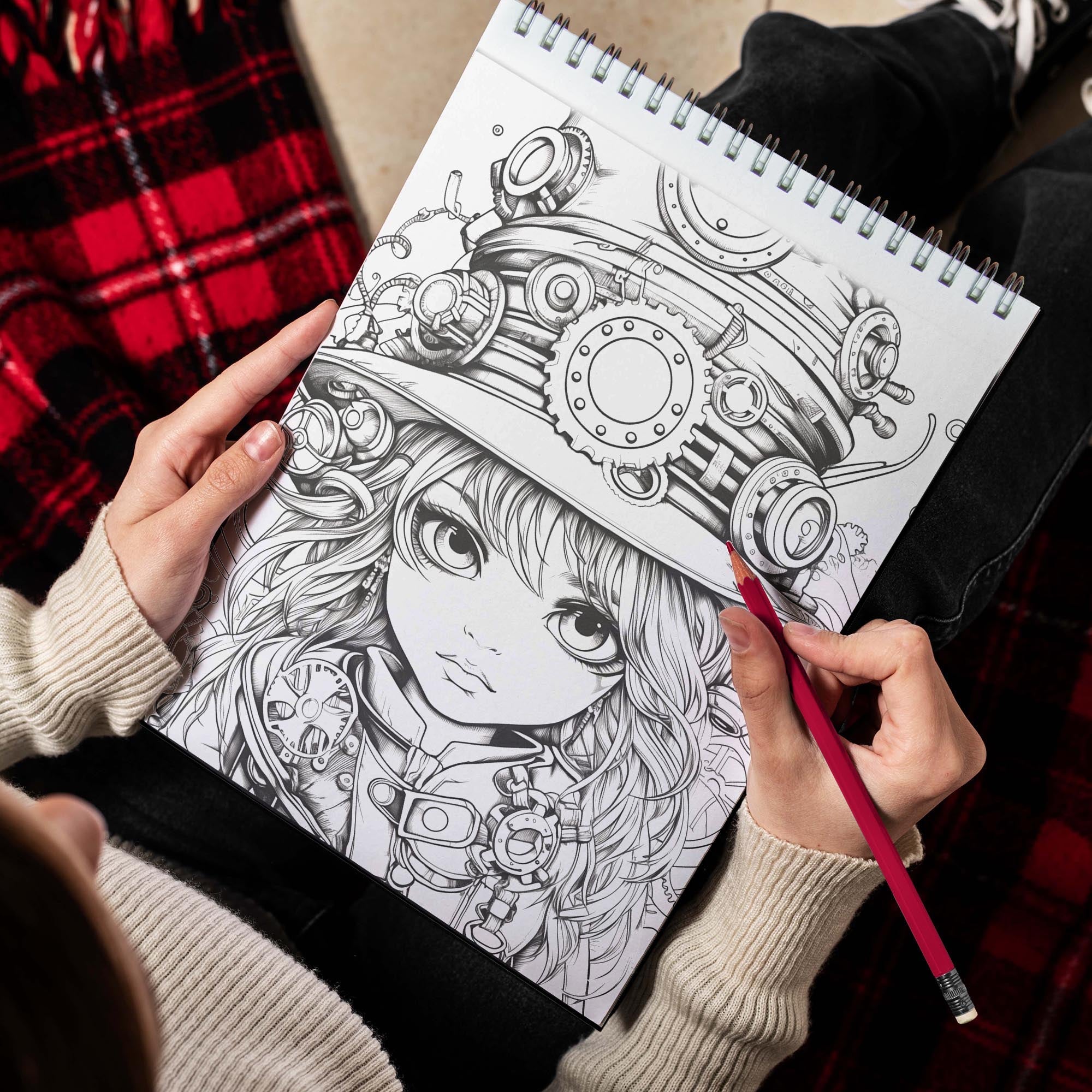 Kawaii Steampunk Girls Spiral Bound Coloring Book, Embark on a Coloring Journey with 30 Pages of Adorable Steampunk Girls in a Whimsical World