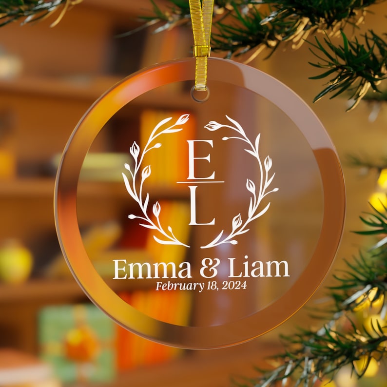 Monogrammed Wedding Glass Ornament White Text / Personalised Wedding Hanging Ornament / Wedding Favours / Wedding Day Gift / Circle