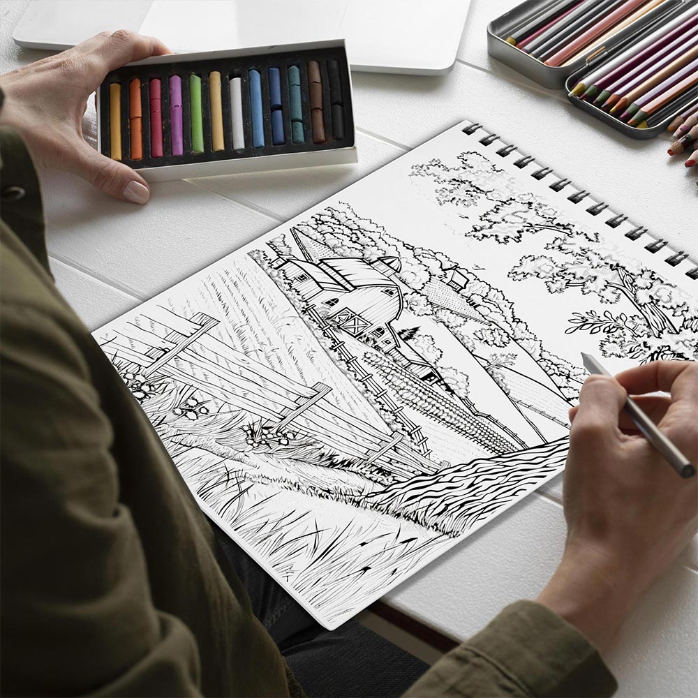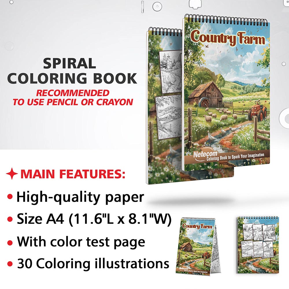 Netecom Country Farm Coloring Book for Adults, Spiral Bound, Soft Cover