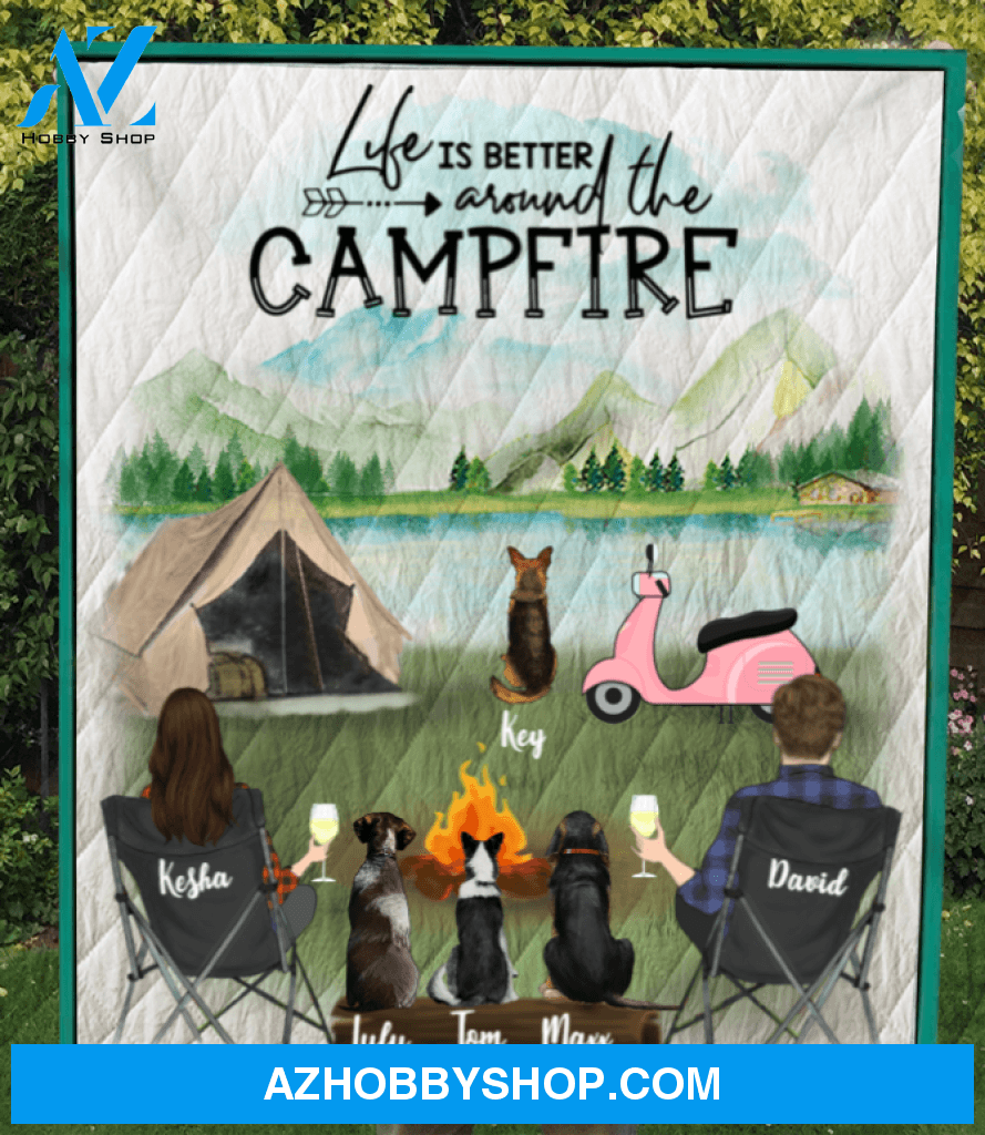 Personalized cat dog & owners camping quilt blanket gift idea for the whole family, cat dog lovers - 4 Pets & Couple - No Camper Version