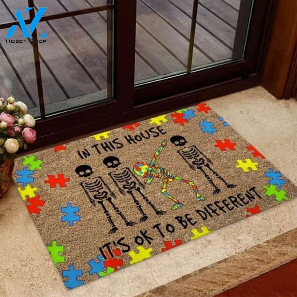 Skeleton In This House It's Ok To Be Different Autism Awareness Pattern Print Doormat | Welcome Mat | House Warming Gift