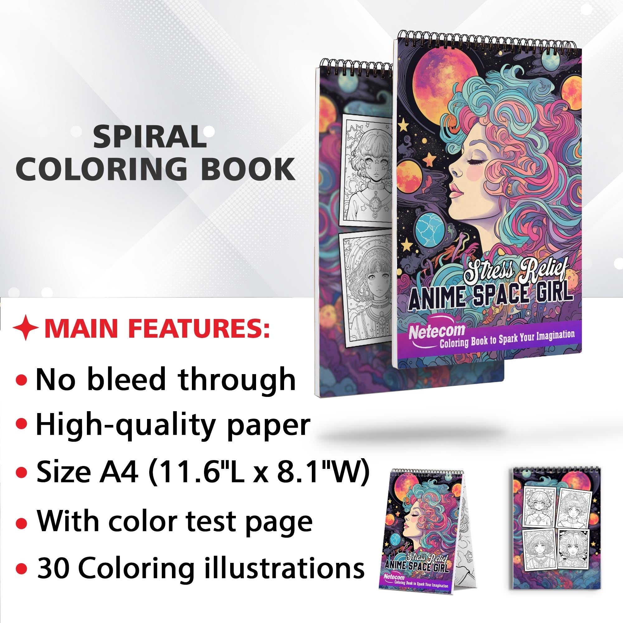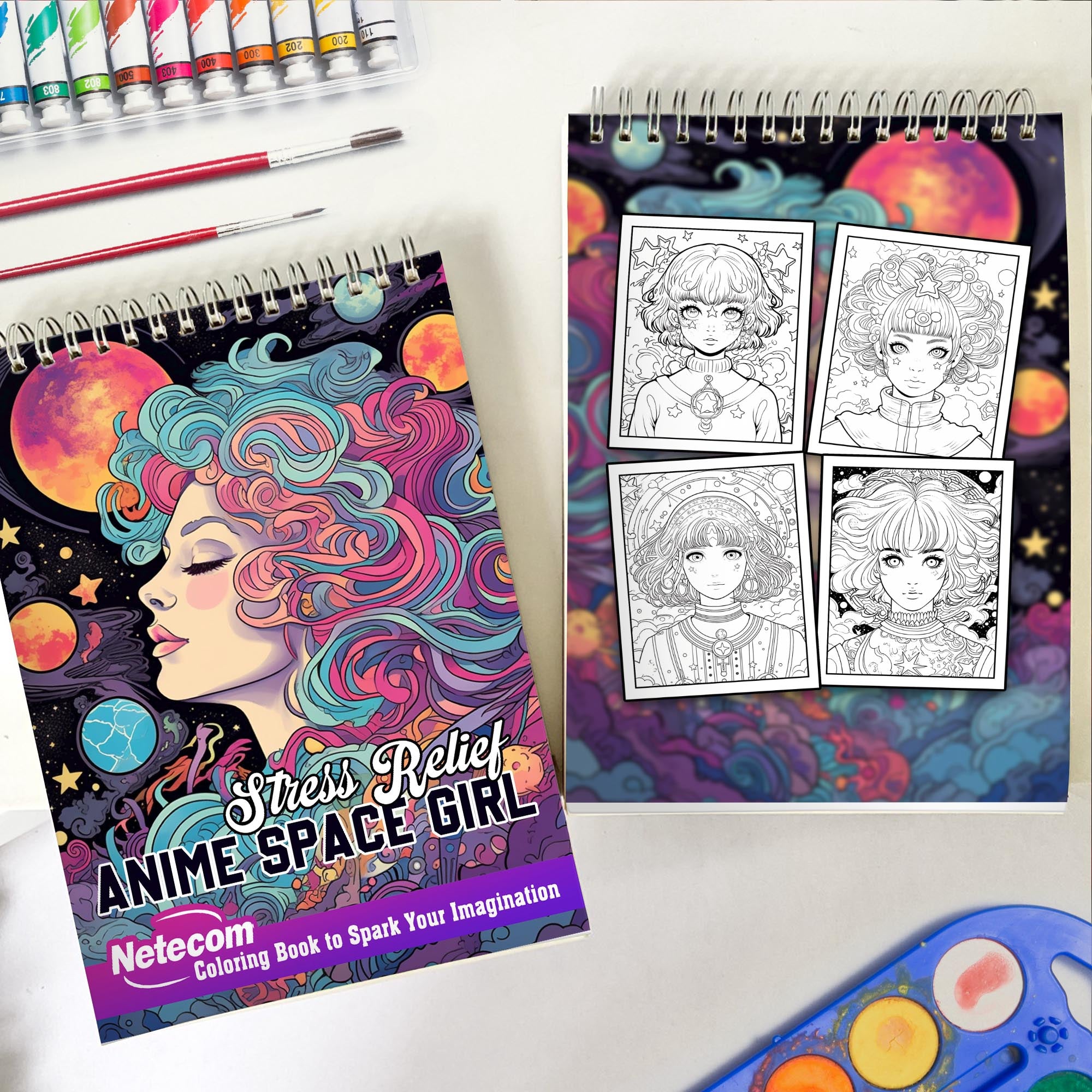 Stress Relief Anime Space Girl Spiral Bound Coloring Book, Find Inner Peace with 30 Meditative Coloring Pages, Depicting Anime Space Girls in Tranquil Cosmic Settings