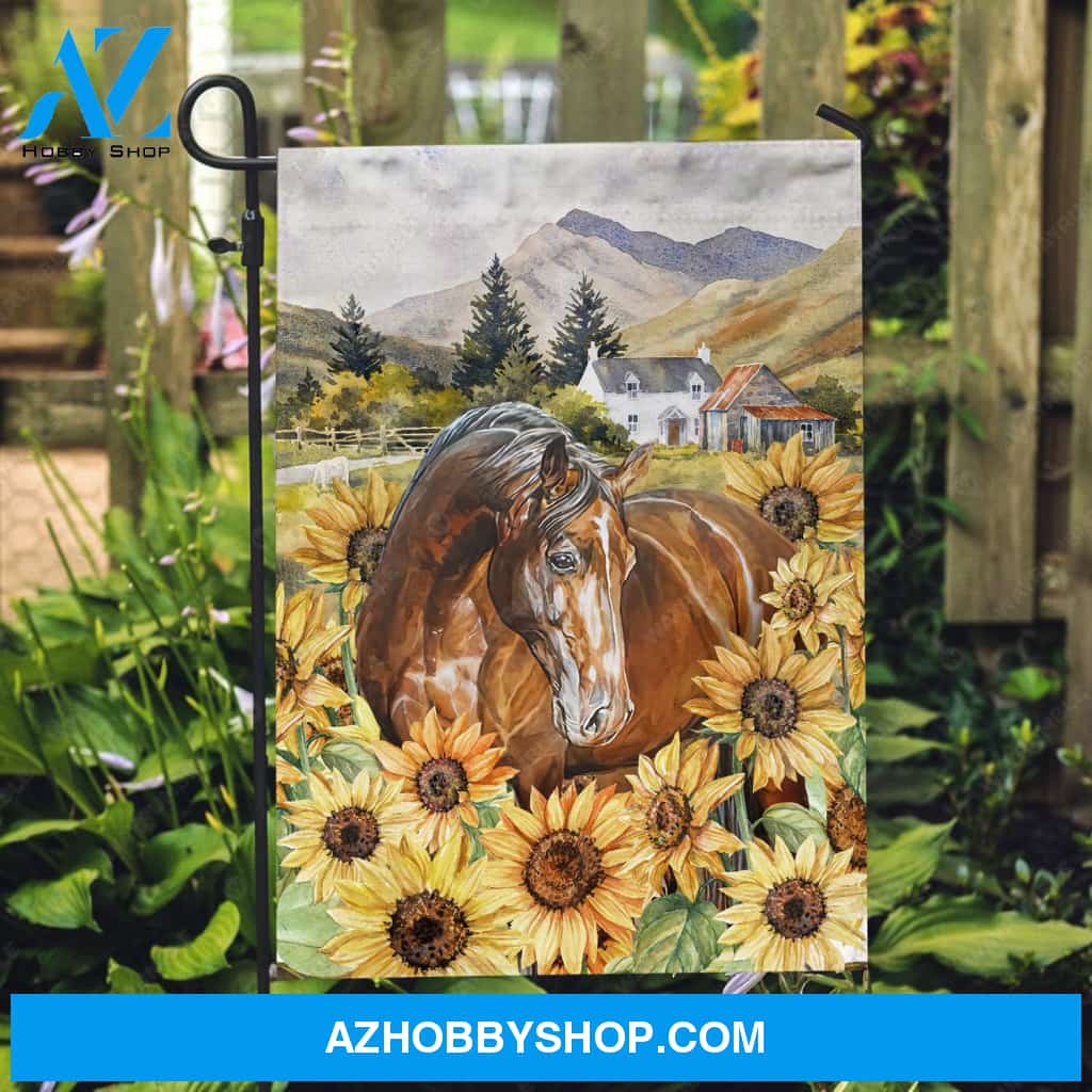 Sunflower field, Brown horse, Beautiful village, Blue mountain - Jesus Flag