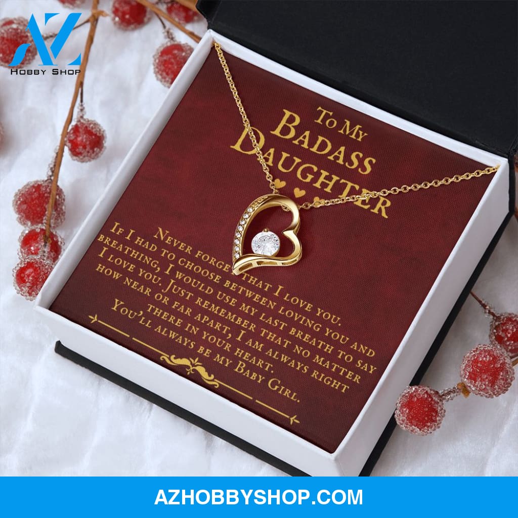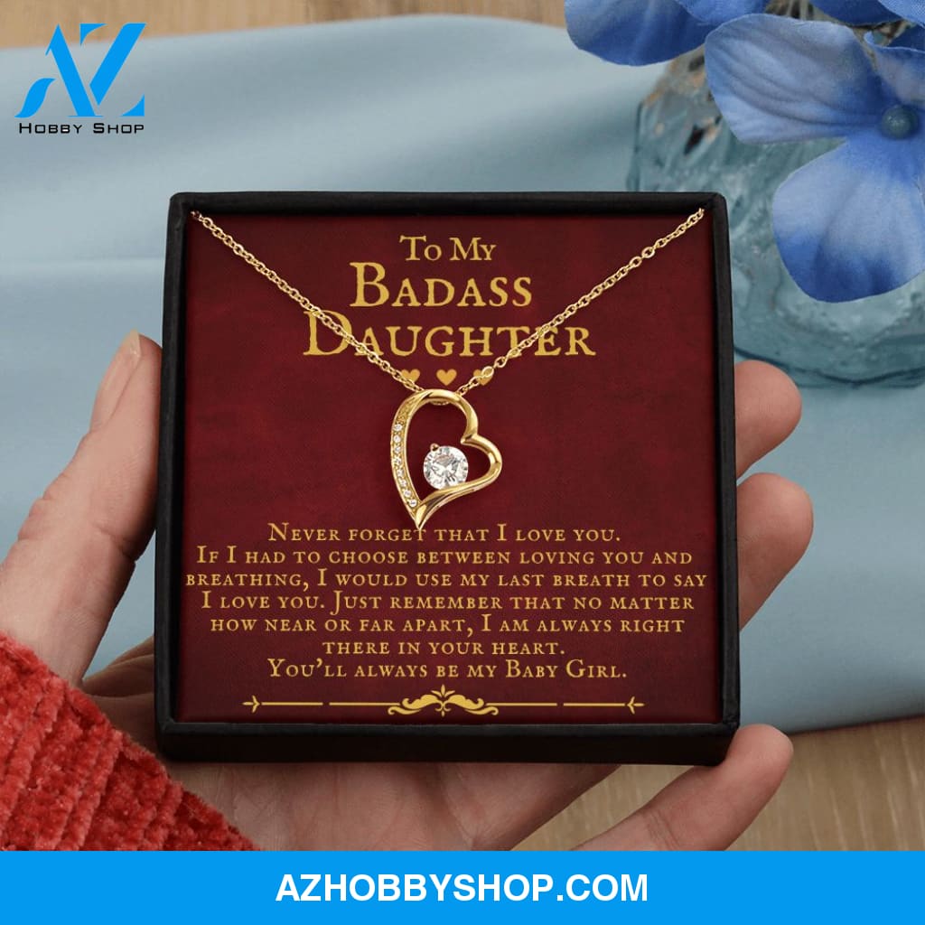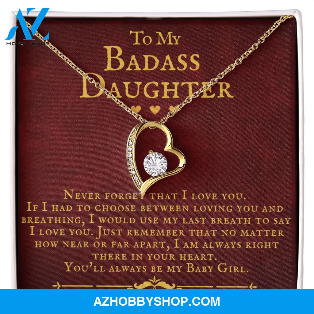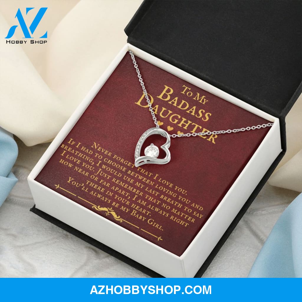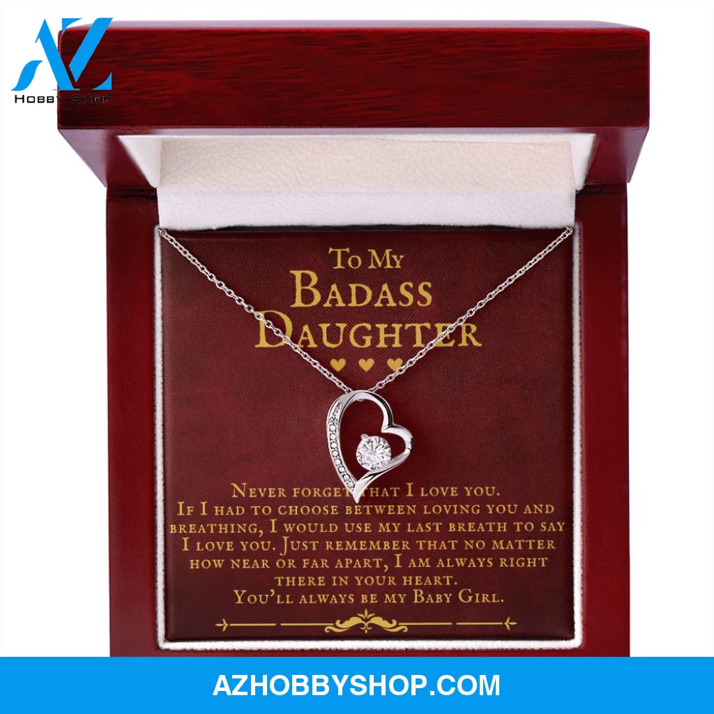 The dazzling "To My Badass Daughter You'll Always Be My Baby Girl Forever Love Necklace" is sure to make her heart melt! This necklace features a stunning 6.5mm CZ crystal surrounded by a polished heart pendant embellished with smaller crystals to add extra sparkle and shine. Beautifully crafted with either white gold or yellow gold finish, be sure to give her a classic gift she can enjoy every day.
