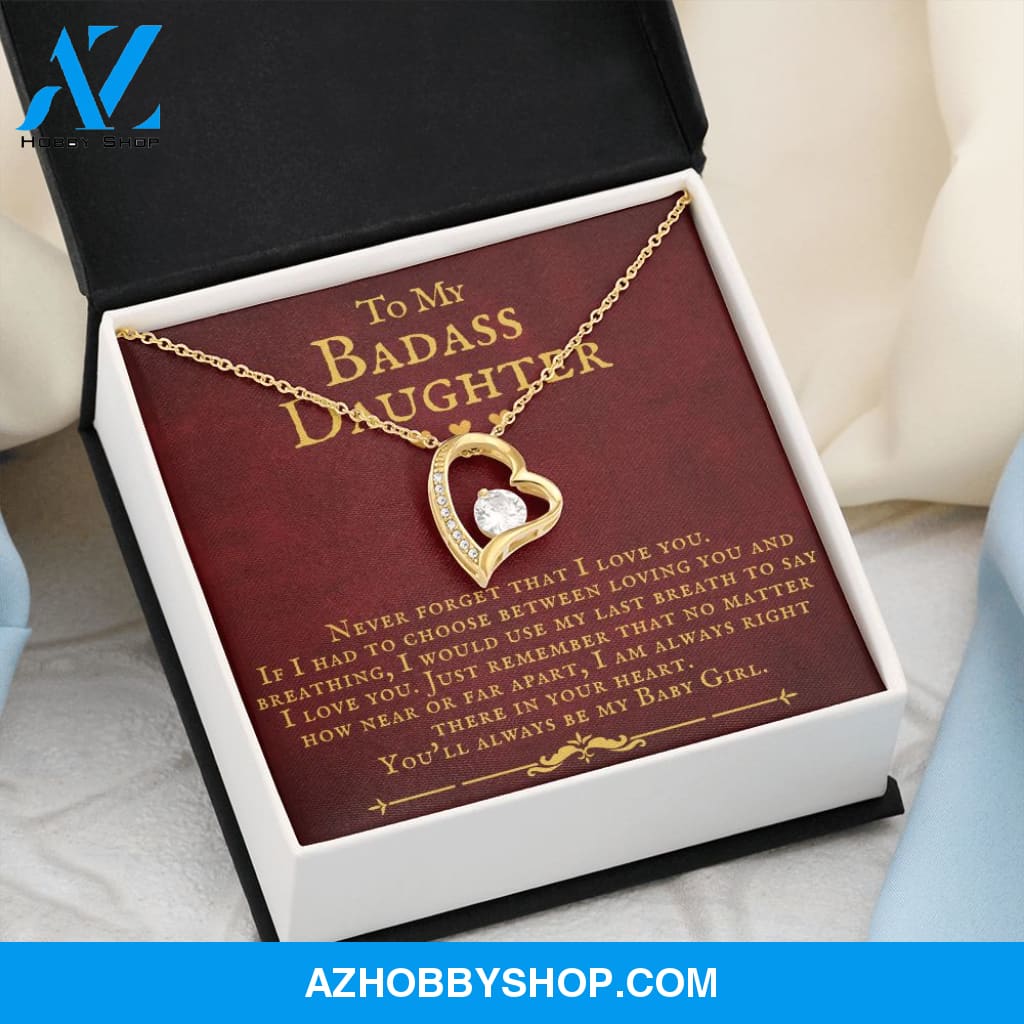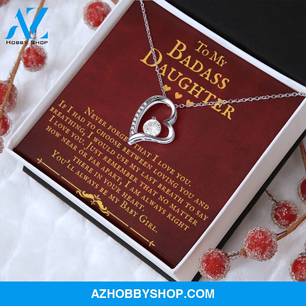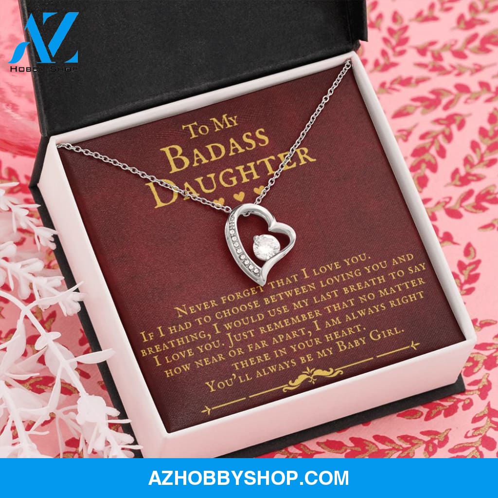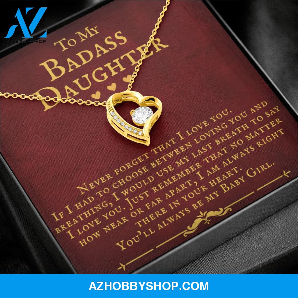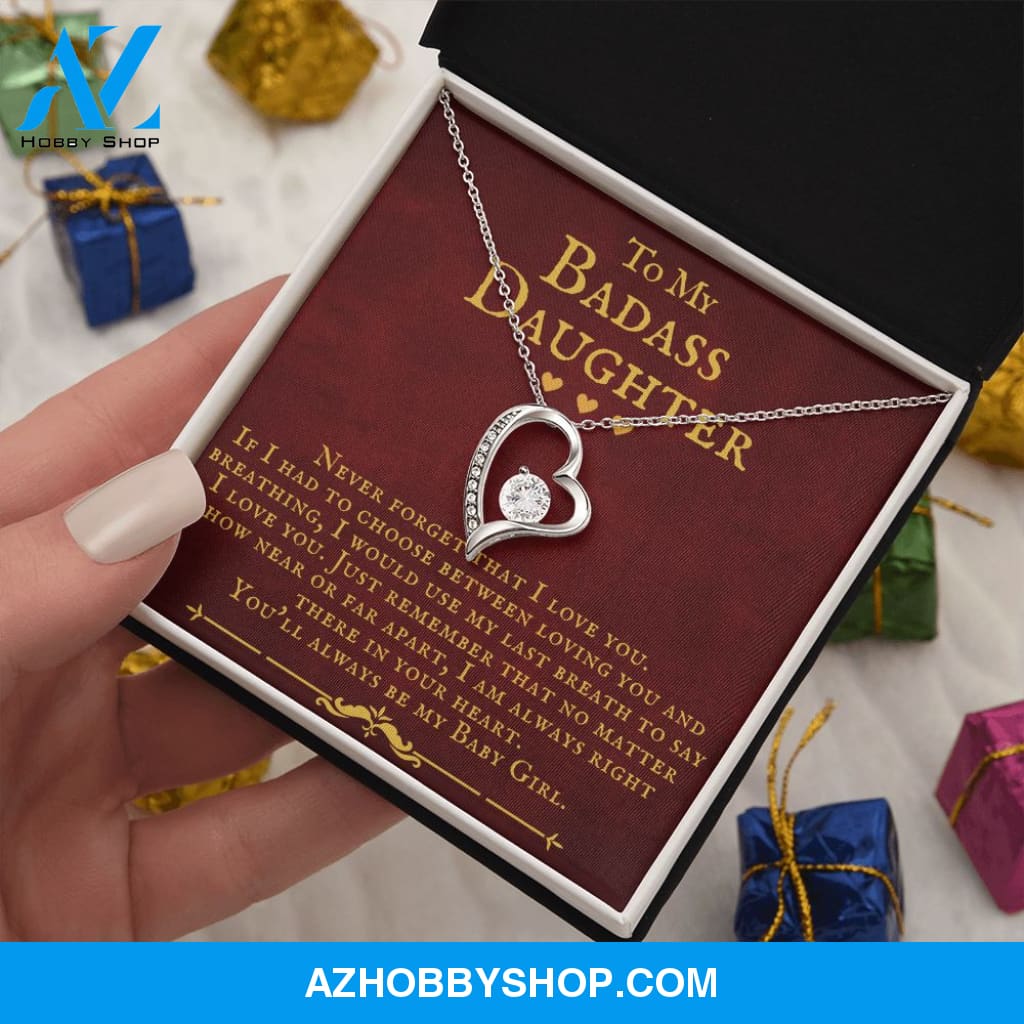 The dazzling "To My Badass Daughter You'll Always Be My Baby Girl Forever Love Necklace" is sure to make her heart melt! This necklace features a stunning 6.5mm CZ crystal surrounded by a polished heart pendant embellished with smaller crystals to add extra sparkle and shine. Beautifully crafted with either white gold or yellow gold finish, be sure to give her a classic gift she can enjoy every day.