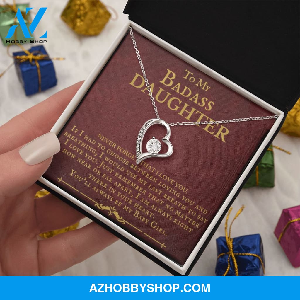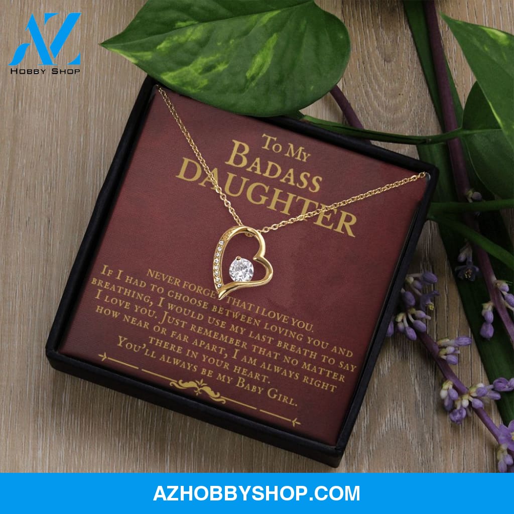The dazzling"To My Badass Daughter You'll Always Be My Baby Girl Forever Love Necklace"is sure to make her heart melt! This necklace features a stunning 6.5mm CZ crystal surrounded by a polished heart pendant embellished with smaller crystals to add extra sparkle and shine. Beautifully crafted with either white gold or yellow gold finish, be sure to give her a classic gift she can enjoy every day.