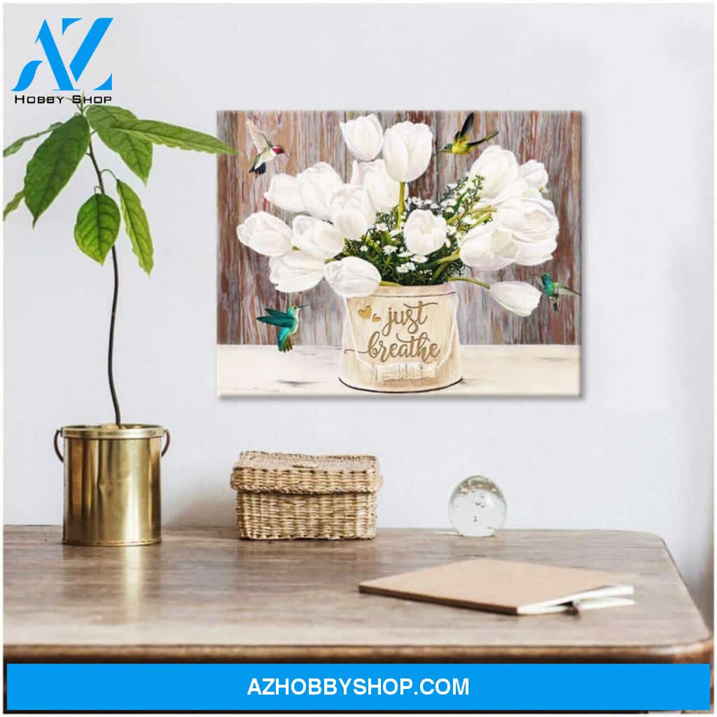 Tulips and Hummingbird Just Breathe Brown Canvas Décor